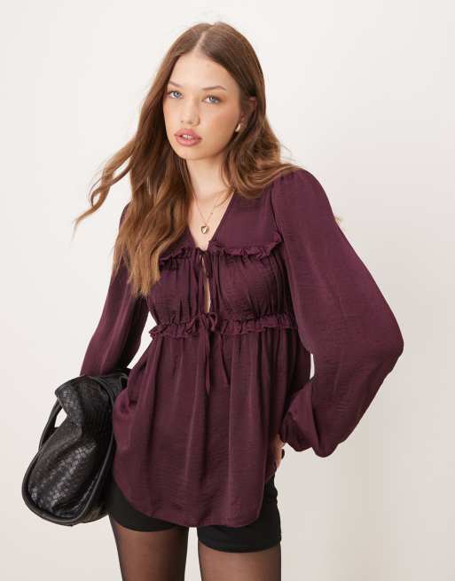 ASOS DESIGN – Marszczona z przodu bordowa bluzka z wiązaniem