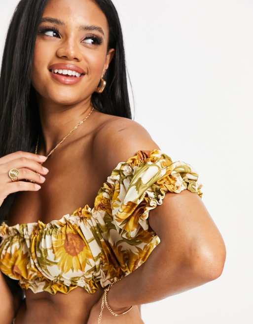 ASOS DESIGN – Marszczony top od bikini o krótkim fasonie z bufkami i wzorem w słoneczniki