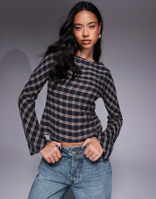 ASOS DESIGN – Marszczony top z długim rękawem i prostym dekoltem w kratkę