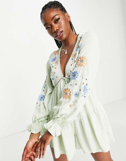 ASOS DESIGN – Miętowozielony zapinany na guziki krótki kombinezon z haftowanym wzorem