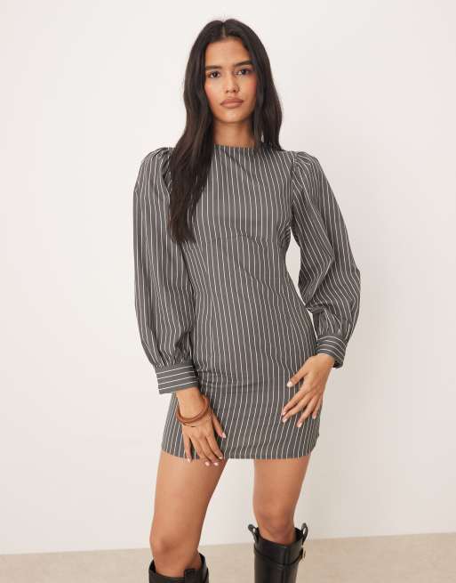 ASOS DESIGN – Modelująca popelinowa sukienka mini w szarym kolorze w prążki z okrągłym dekoltem i obszernymi rękawami