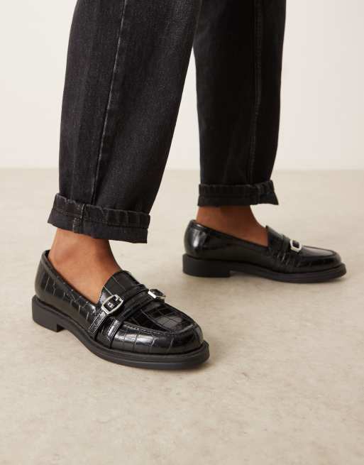 ASOS DESIGN – Molly – Czarne loafersy z imitacji skóry krokodyla z dwoma klamrami