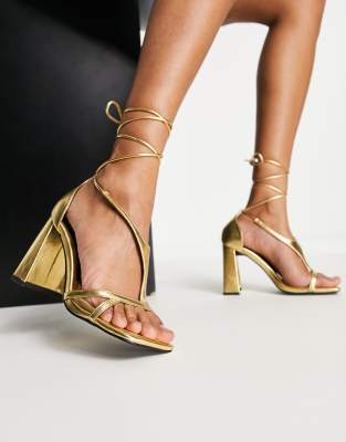 ASOS DESIGN – Natalia – Złote sandały z pasków na obcasie klockowym