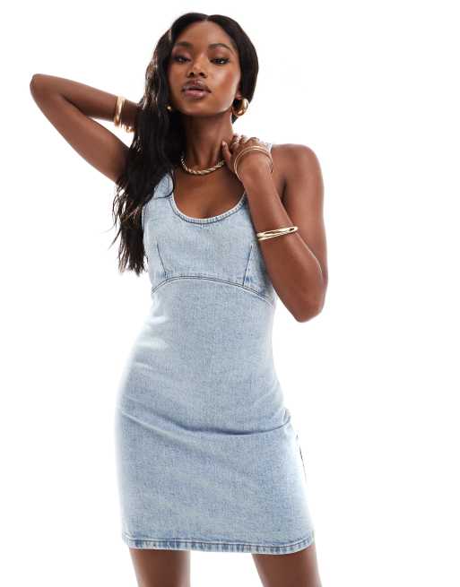 ASOS DESIGN – Niebieska bielona jeansowa sukienka na szelkach o dopasowanym kroju
