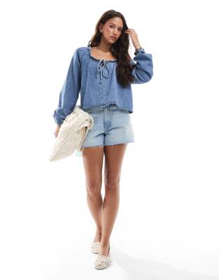 ASOS DESIGN – Niebieska bluzka jeansowa z balonowymi rękawami i dodatkiem lnu