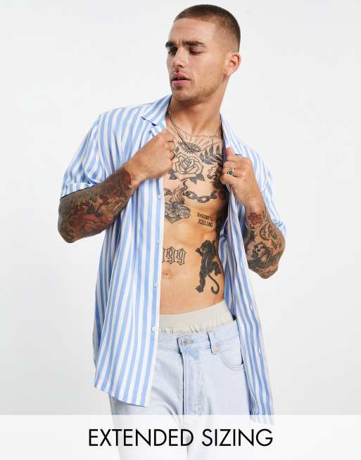 ASOS DESIGN – Niebieska koszula o luźnym kroju w paski z kołnierzykiem kubańskim