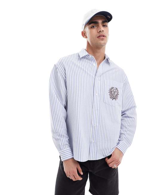 ASOS DESIGN – Niebieska koszula oversize w paski z haftowaną wstawką
