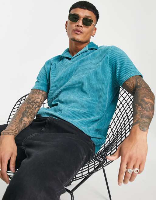ASOS DESIGN – Niebieska luźna koszulka polo z kubańskim kołnierzykiem z prążkowanego weluru