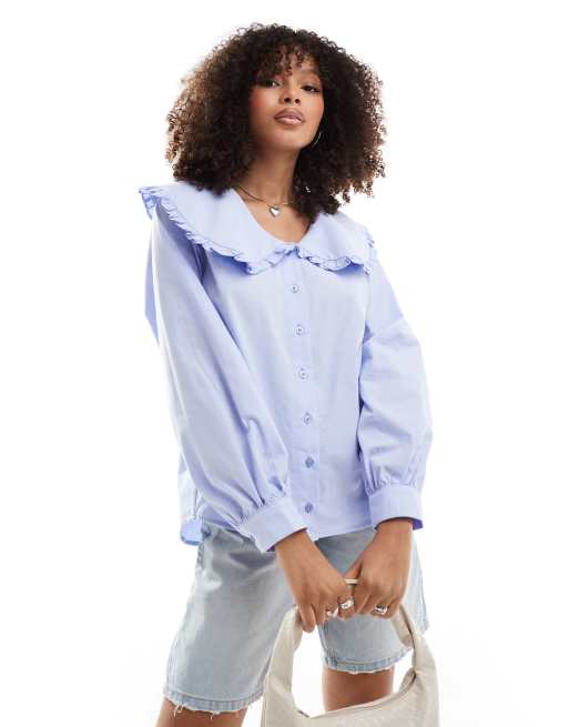 ASOS DESIGN – Niebieska popelinowa koszula oversize z kołnierzykiem z falbanką