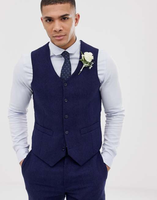 ASOS DESIGN – Niebieska ślubna kamizelka garniturowa w jodełkę o dopasowanym kroju z domieszką wełny