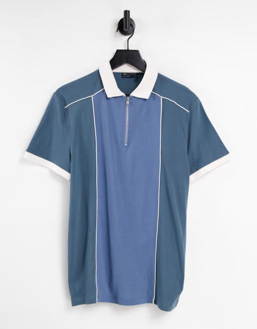 ASOS DESIGN – Niebieski T-shirt polo z blokami kolorów i zamkiem do połowy długości