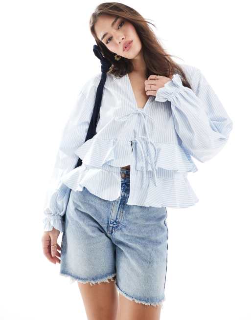 ASOS DESIGN – Niebieski top w paski z długimi rękawami, wiązaniem z przodu i falbanką