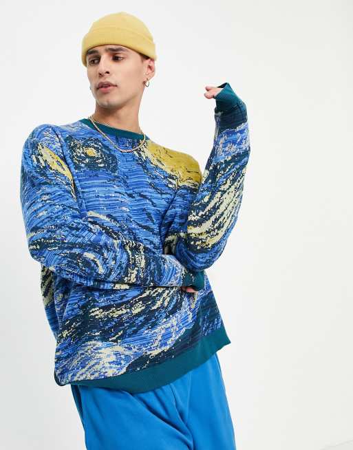ASOS DESIGN – Niebieski żakardowy sweter z motywem z obrazu Van Gogha
