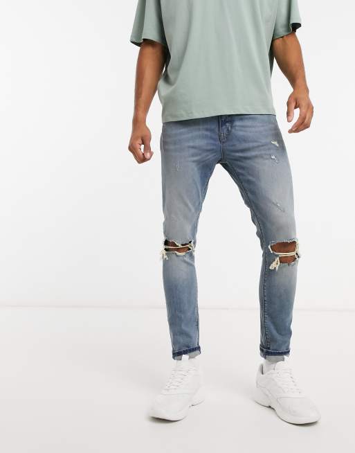 ASOS DESIGN – Niebieskie bardzo obcisłe jeansy o krótkim fasonie z przetarciami na kolanach