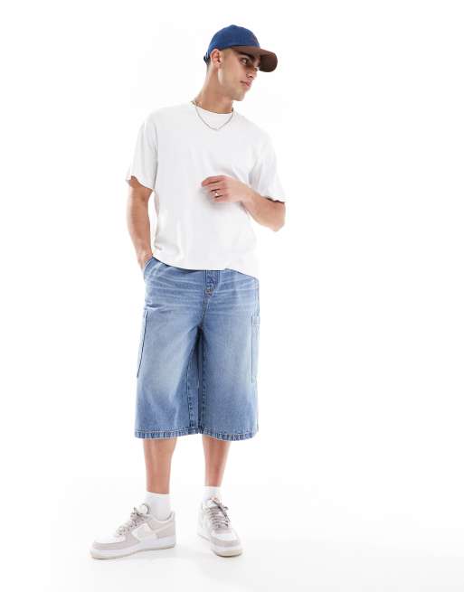 ASOS DESIGN – Niebieskie jeansowe jortsy o wydłużonym fasonie z kieszeniami cargo