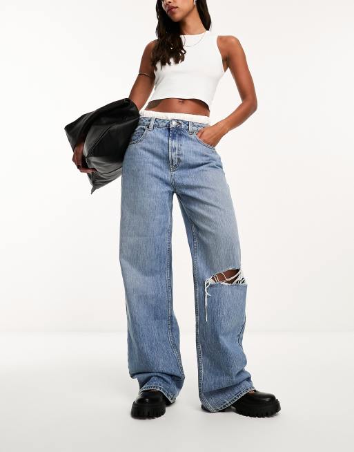 ASOS DESIGN – Niebieskie jeansy dad fit z przedarciami