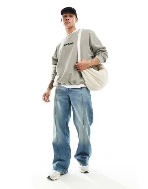 ASOS DESIGN – Niebieskie szerokie jeansy z rozszerzanymi nogawkami z ozdobnym szwem z przodu