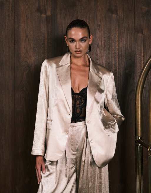 ASOS DESIGN – Nieusztywniana dopasowana satynowa marynarka w kolorze ostrygi