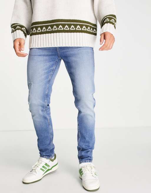 ASOS DESIGN – Obcisłe niebieskie jeansy z przetarciami