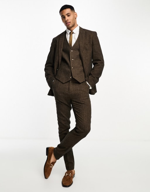 ASOS DESIGN – Obcisły garnitur z domieszką wełny w kolorze tytoniu we wzór w jodełkę