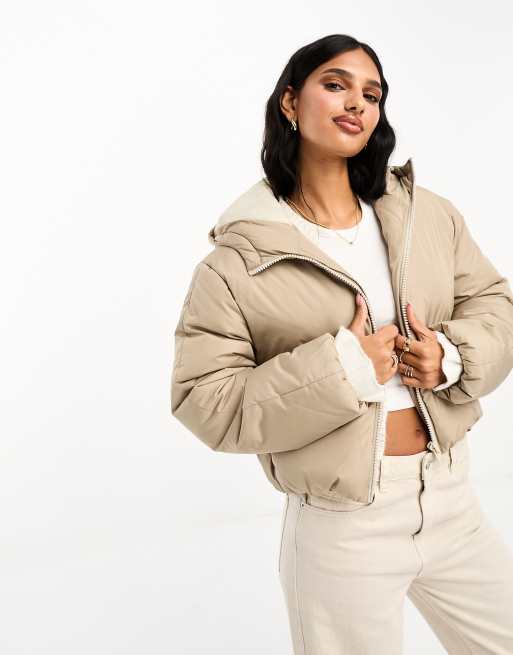 ASOS DESIGN – Ocieplana kurtka z kapturem o krótkim fasonie w neutralnym kolorze