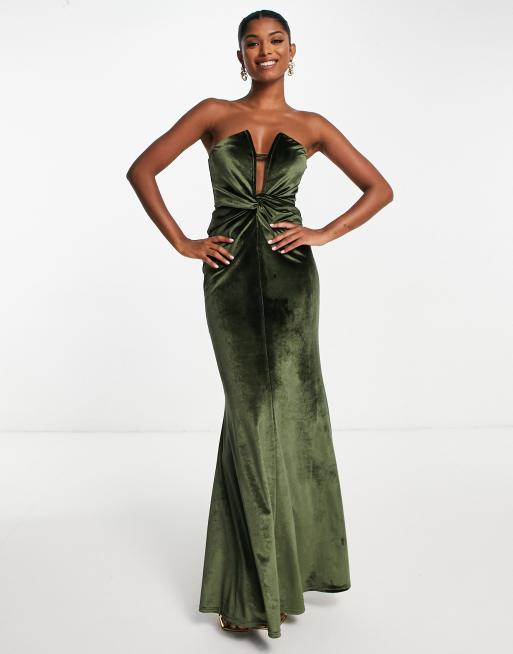ASOS DESIGN – Oliwkowa aksamitna sukienka maxi z głębokim dekoltem w szpic i skręconym przodem