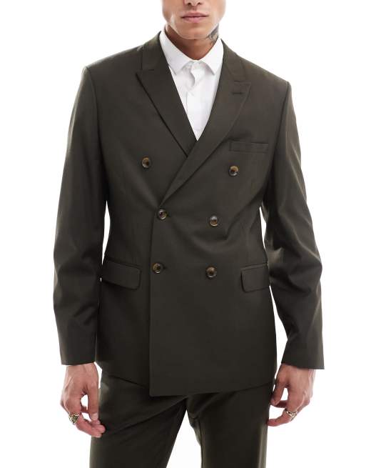 ASOS DESIGN – Oliwkowa dopasowana dwurzędowa marynarka z domieszką wełny