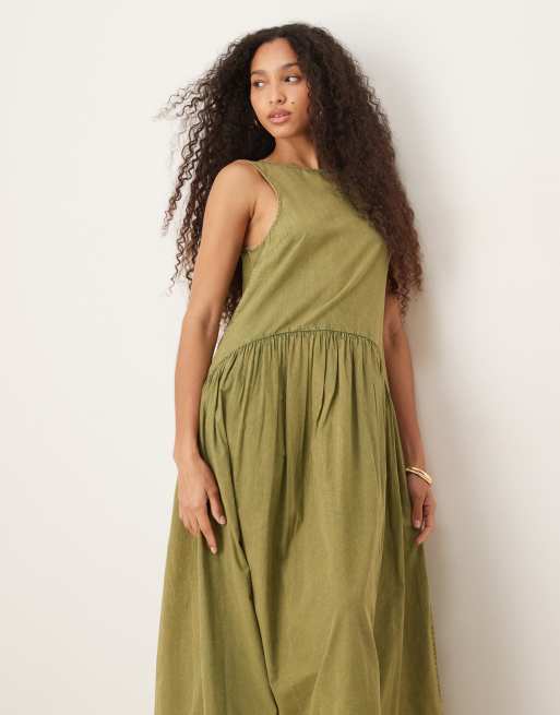 ASOS DESIGN – Oliwkowa luźna sukienka midi z prostym dekoltem i obniżoną talią