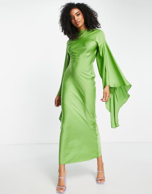 ASOS DESIGN – Oliwkowa satynowa sukienka maxi z drapowanymi rękawami i odkrytymi plecami