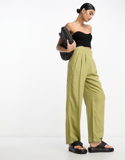 ASOS DESIGN – Oliwkowe spodnie z ozdobnymi szwami w talii z domieszką lnu