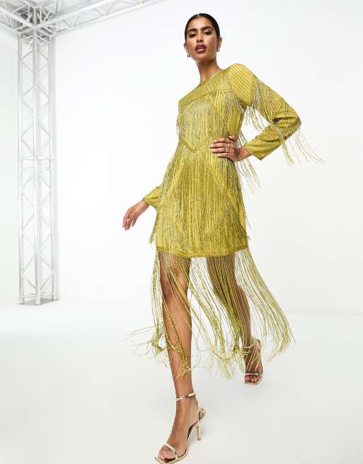 ASOS DESIGN – Oliwkowozielona zdobiona sukienka mini z frędzlami z koralików