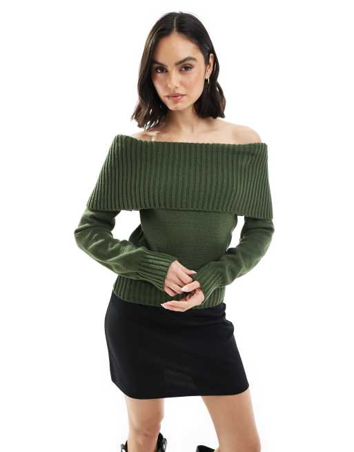 ASOS DESIGN – Oliwkowy dzianinowy sweter z prążkowanym dekoltem bardot