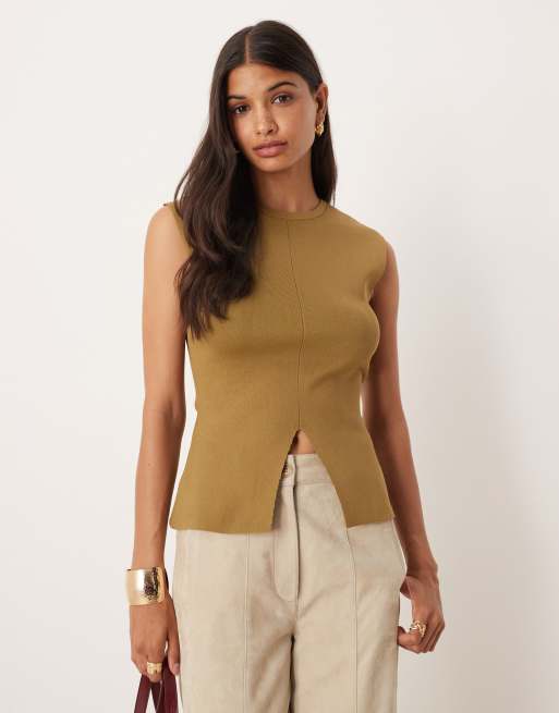 ASOS DESIGN – Oliwkowy przylegający top z dzianiny o gęstym splocie z rozcięciem z przodu