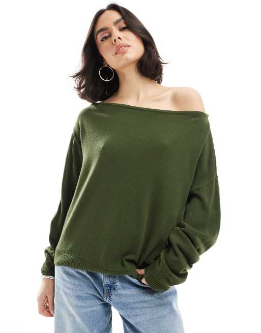 ASOS DESIGN – Oliwkowy sweter na jedno ramię o bardzo luźnym kroju