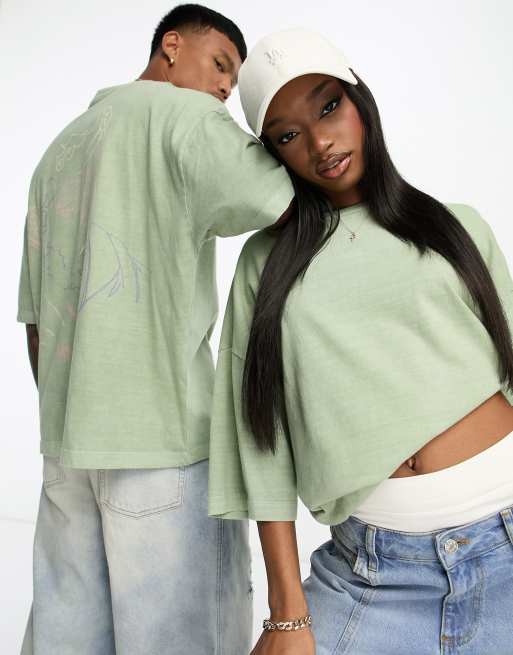 ASOS DESIGN – Oliwkowy T-shirt oversize unisex ze rysunkowym nadrukowanym z tyłu i efektem sprania