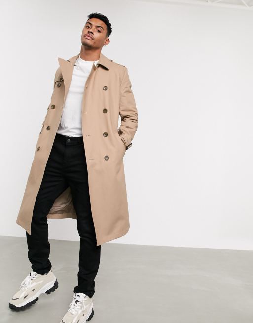 ASOS DESIGN – Piaskowy, długi trencz z paskiem z tkaniny wodoodpornej