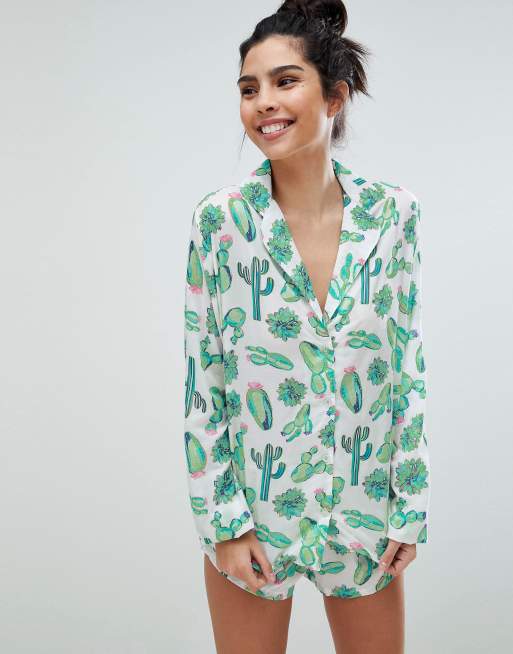 ASOS DESIGN – Piżama ze 100% modalu we wzór w kaktusy z koszulą i szortami