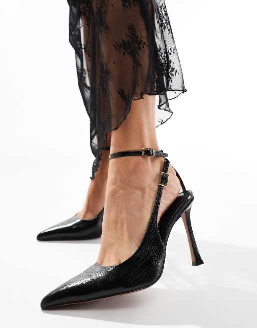 ASOS DESIGN – Playful – Czarne szpilki z paskiem za piętą z imitacji skóry węża