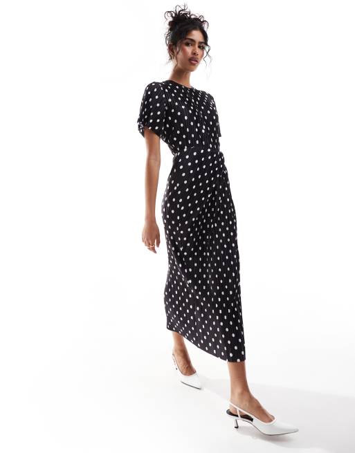 ASOS DESIGN – Plisowana bordowa sukienka midi w kolorze kości słoniowej z krótkim rękawem, skręconą wstawką na spódnicy i wzorem