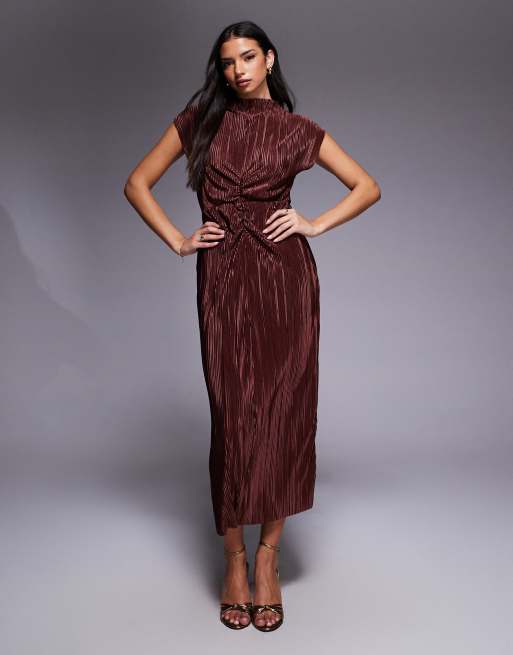 ASOS DESIGN – Plisowana czekoladowa sukienka midi z marszczeniem i zabudowanym dekoltem
