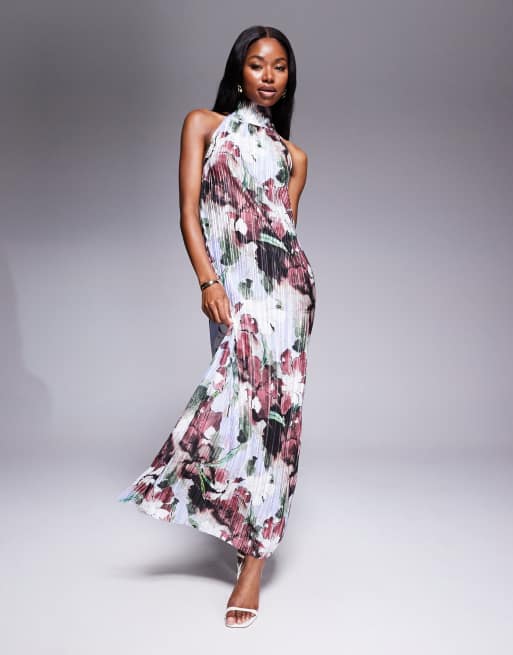 ASOS DESIGN – Plisowana sukienka maxi w ciemny kwiatowy wzór z wiązanym dekoltem halter