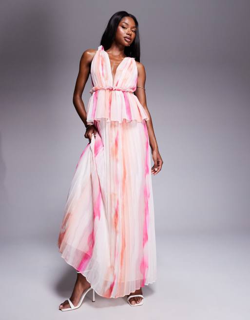 ASOS DESIGN – Plisowana sukienka midi z głębokim dekoltem i baskinką we wzór w rozmyte paski