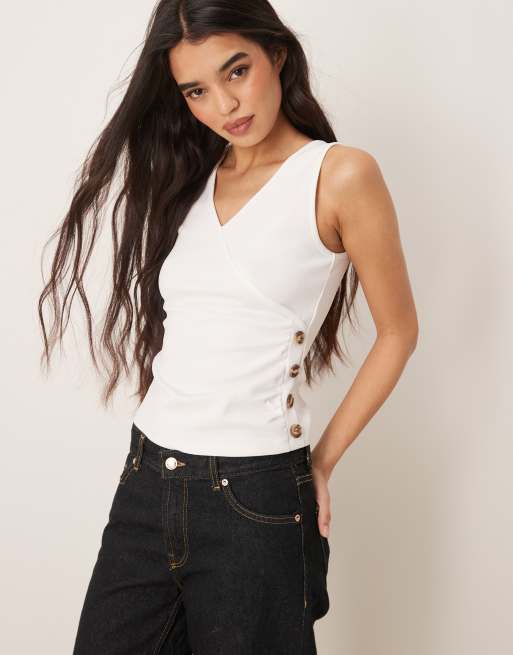 ASOS DESIGN – Podkoszulek o kroju kopertowym z tkaniny cupro w kolorze ecru z guzikami