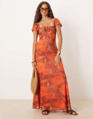 ASOS DESIGN – Pomarańczowa siateczkowa sukienka midi typu milkmaid ze wzorem i odkrytymi plecami