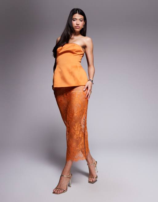 ASOS DESIGN – Pomarańczowa spódnica midaxi z delikatnej, prześwitującej koronki