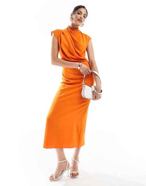 ASOS DESIGN – Pomarańczowa sukienka midi bez rękawów z zabudowanym dekoltem i drapowaniem