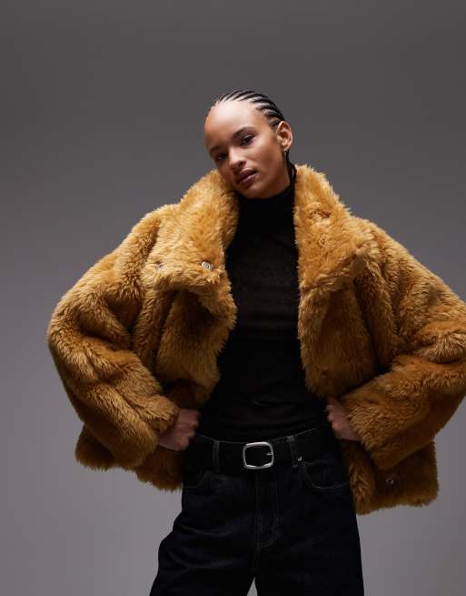 ASOS DESIGN – Pomarańczowobrązowa kurtka bomberka ze sztucznego futra z bufiastym dołem