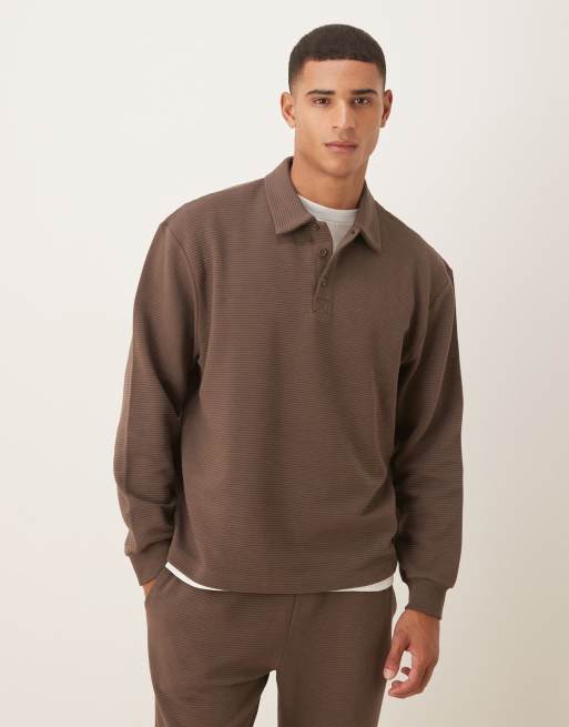 ASOS DESIGN – Prążkowana brązowa bluza o luźnym kroju z kołnierzykiem polo
