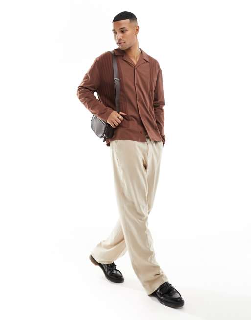 ASOS DESIGN – Prążkowana brązowa koszula o luźnym kroju z kołnierzykiem kubańskim