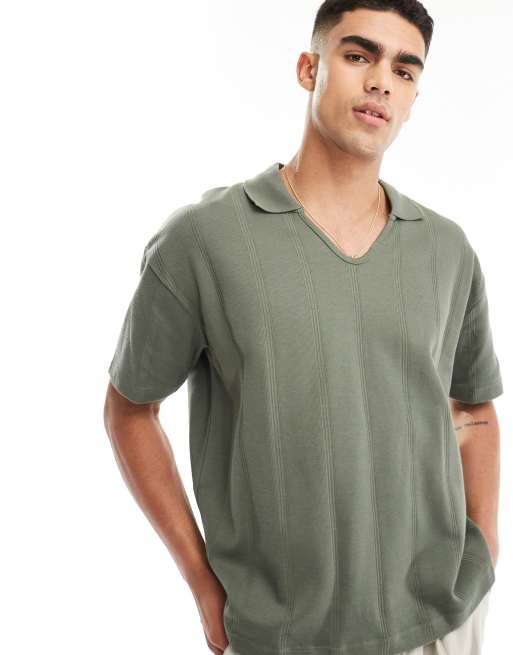 ASOS DESIGN – Prążkowana koszulka polo oversize z dekoltem w szpic w kolorze khaki